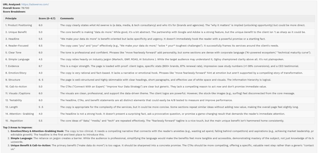 - Scores it across a structured set of Ogilvy-inspired principles (e.g., positioning, unique benefit, headline strength, clarity, simplicity, proof, story, CTAs, visual support, testability).