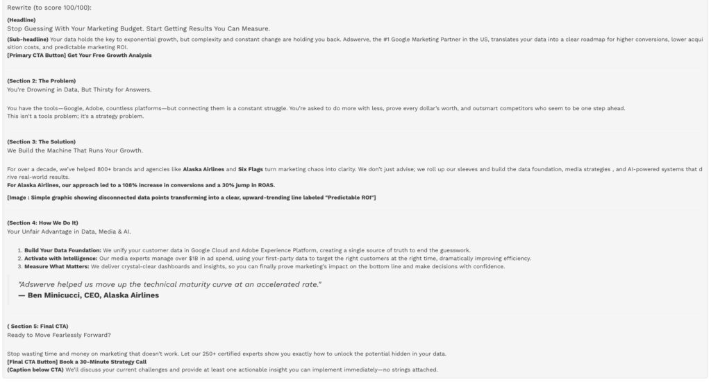 This goes way beyond “your headline could be better.” The agent evaluates structure, clarity, proof, emotion, calls-to-action, and testability, then outputs a prioritized, experiment-ready roadmap.